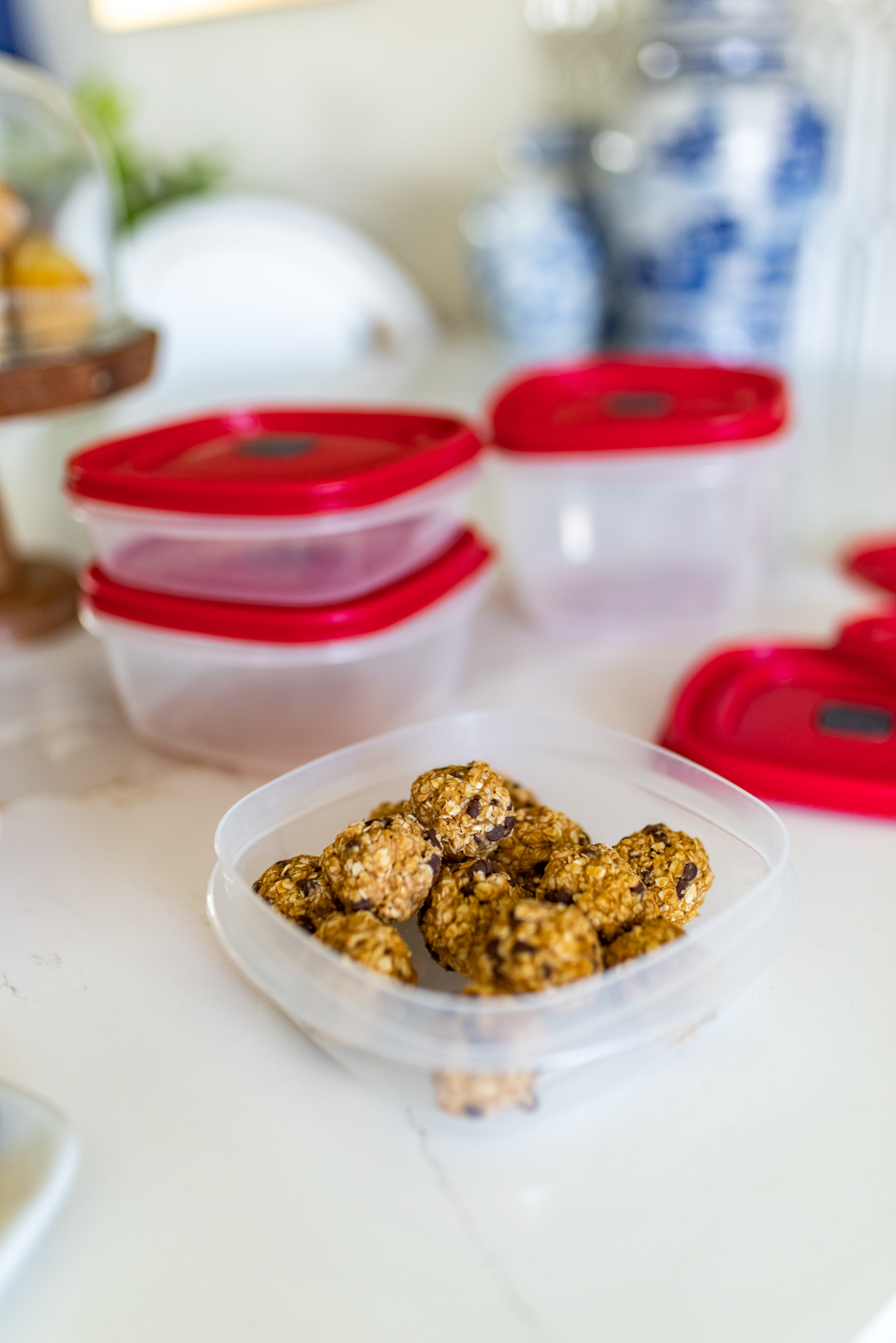 I have the Rubbermaid EasyFindLids containers in a variety of sizes and I love the vented lids as well! These are not only perfect for storing my granola balls, but makes my life SO MUCH EASIER when there’s an easy snack my kids can grab on their own. My husband takes a few to work in a smaller container and I love the convenience of grabbing a couple on my way out the door to run errands! There are a plethora of ways to use these containers! You can find these Rubbermaid products, HERE.