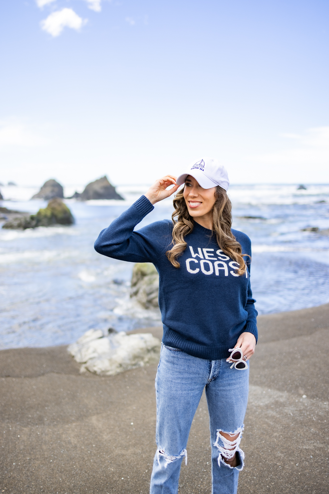 Living in California, we visit the coast often. Growing up, my family (parents are originally from NY) would take us to LBI every Summer. Maybe that’s why the ocean is such a special relaxing place for me. Out of all the places, though, that Neil and I have visited together, our favorite place to spend time is up on the coast in Northern California. I literally walk out onto the sand, and I’m instantly at peace. The weather is always cooler up in the Westport area and so I like to bring layers. This West Coast Cashmere sweater is no exception. It’s cute, it’s comfy and it’s navy blue!